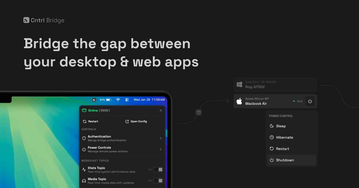 A lightweight system tray app that exposes your PC as a controllable API - monitor stats, control media, manage processes, and trigger power actions from any device on your network.